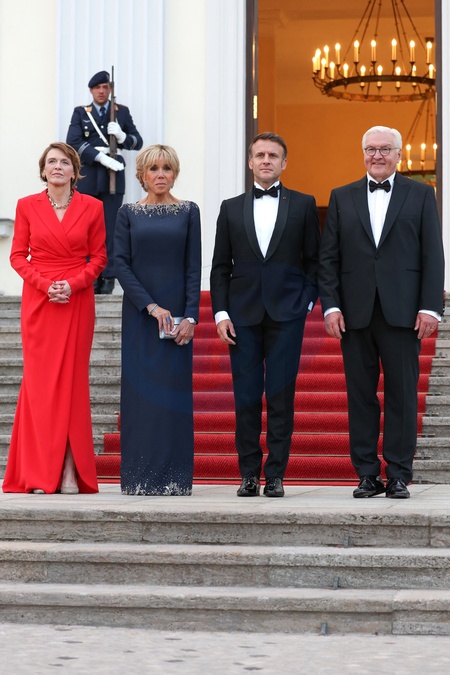 Le président français, Emmanuel Macron et la première dame, Brigitte Macron accueilis par Franck-Walter Steinmeier, président de la république fédérale d'Allemagne et madame Elke Budenbender pour un diner d'état, au château de Bellevue, lors une visite d'Etat de trois jours en Allemagne, le 26 mai 2024. © Stéphane Lemouton / Bestimage The French President, Emmanuel Macron and the First Lady, Brigitte Macron welcomed by Franck-Walter Steinmeier, President of the Federal Republic of Germany and Mrs. Elke Budenbender for a state dinner, at Bellevue Castle, during a state visit three days in Germany