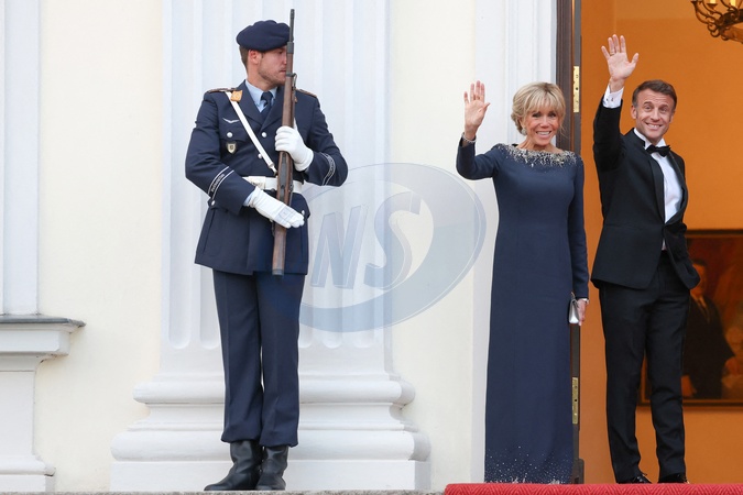 Le président français, Emmanuel Macron et la première dame, Brigitte Macron accueilis par Franck-Walter Steinmeier, président de la république fédérale d'Allemagne et madame Elke Budenbender pour un diner d'état, au château de Bellevue, lors une visite d'Etat de trois jours en Allemagne, le 26 mai 2024. © Stéphane Lemouton / Bestimage The French President, Emmanuel Macron and the First Lady, Brigitte Macron welcomed by Franck-Walter Steinmeier, President of the Federal Republic of Germany and Mrs. Elke Budenbender for a state dinner, at Bellevue Castle, during a state visit three days in Germany