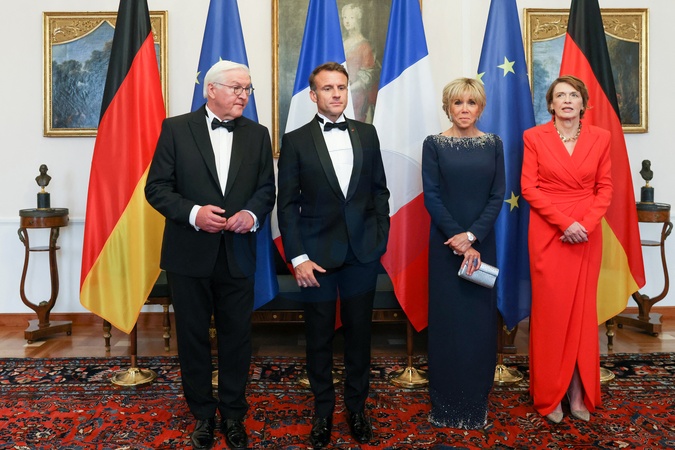Le président français, Emmanuel Macron et la première dame, Brigitte Macron accueilis par Franck-Walter Steinmeier, président de la république fédérale d'Allemagne et madame Elke Budenbender pour un diner d'état, au château de Bellevue, lors une visite d'Etat de trois jours en Allemagne, le 26 mai 2024. © Stéphane Lemouton / Bestimage The French President, Emmanuel Macron and the First Lady, Brigitte Macron welcomed by Franck-Walter Steinmeier, President of the Federal Republic of Germany and Mrs. Elke Budenbender for a state dinner, at Bellevue Castle, during a state visit three days in Germany