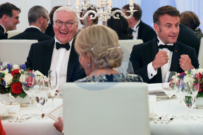 Le président français, Emmanuel Macron et la première dame, Brigitte Macron accueilis par Franck-Walter Steinmeier, président de la république fédérale d'Allemagne et madame Elke Budenbender pour un diner d'état, au château de Bellevue, lors une visite d'Etat de trois jours en Allemagne, le 26 mai 2024. © Stéphane Lemouton / Bestimage The French President, Emmanuel Macron and the First Lady, Brigitte Macron welcomed by Franck-Walter Steinmeier, President of the Federal Republic of Germany and Mrs. Elke Budenbender for a state dinner, at Bellevue Castle, during a state visit three days in Germany