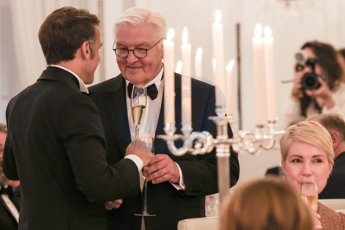 Le président français, Emmanuel Macron et la première dame, Brigitte Macron accueilis par Franck-Walter Steinmeier, président de la république fédérale d'Allemagne et madame Elke Budenbender pour un diner d'état, au château de Bellevue, lors une visite d'Etat de trois jours en Allemagne, le 26 mai 2024. © Stéphane Lemouton / Bestimage The French President, Emmanuel Macron and the First Lady, Brigitte Macron welcomed by Franck-Walter Steinmeier, President of the Federal Republic of Germany and Mrs. Elke Budenbender for a state dinner, at Bellevue Castle, during a state visit three days in Germany