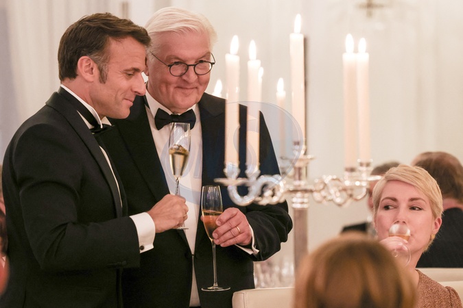 Le président français, Emmanuel Macron et la première dame, Brigitte Macron accueilis par Franck-Walter Steinmeier, président de la république fédérale d'Allemagne et madame Elke Budenbender pour un diner d'état, au château de Bellevue, lors une visite d'Etat de trois jours en Allemagne, le 26 mai 2024. © Stéphane Lemouton / Bestimage The French President, Emmanuel Macron and the First Lady, Brigitte Macron welcomed by Franck-Walter Steinmeier, President of the Federal Republic of Germany and Mrs. Elke Budenbender for a state dinner, at Bellevue Castle, during a state visit three days in Germany