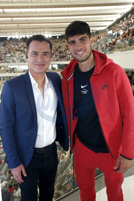 Exclusif - Laurent Luyat et Carlos Alcaraz - Plateau de France Télévision lors des Internationaux de France de Tennis de Roland Garros 2024 - Jour 1 à Paris le 26 Mai 2024. © Bertrand Rindoff / Bestimage France Television set during the 2024 Tennis French Open of Roland Garros - Day 1 in Paris, France