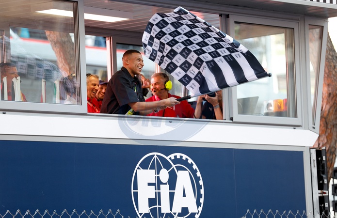 Kylian Mbappe of France with the checkered flag, drapeau during the Formula 1 Grand Prix de Monaco 2024, 8th round of the 2024 Formula One World Championship from May 23 to 26, 2024 on the Circuit de Monaco, in Monaco -