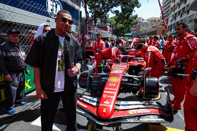 Footballer Kylian Mbappé on the starting grid with the Scuderia Ferrari SF-24 of Charles Leclerc during the Formula 1 Grand Prix de Monaco 2024, 8th round of the 2024 Formula One World Championship from May 23 to 26, 2024 on the Circuit de Monaco, in Monaco -