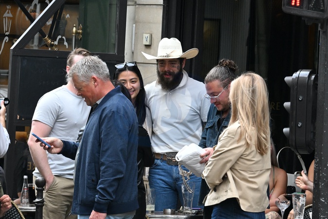Exclusif - Le chanteur américain Post Malone est allé boire une verre à la coupe d'or de la rue Saint-Honoré à Paris le 26 mai 2024. Il a crée une émeute devant le bar car tout le monde l'a reconnu. Exclusive - For Germany call for price - American singer Post Malone went for a drink at the Coupe d'Or on rue Saint-Honoré in Paris on May 26, 2024. He created a riot in front of the bar because everyone recognized him.
