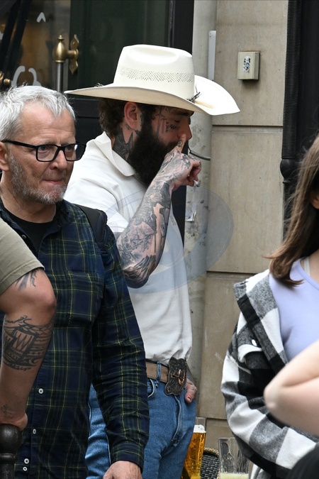 Exclusif - Le chanteur américain Post Malone est allé boire une verre à la coupe d'or de la rue Saint-Honoré à Paris le 26 mai 2024. Il a crée une émeute devant le bar car tout le monde l'a reconnu. Exclusive - For Germany call for price - American singer Post Malone went for a drink at the Coupe d'Or on rue Saint-Honoré in Paris on May 26, 2024. He created a riot in front of the bar because everyone recognized him.