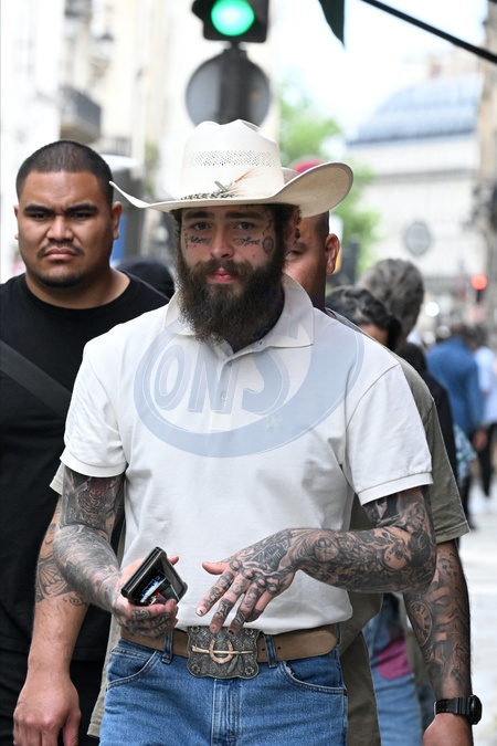 Exclusif - Le chanteur américain Post Malone est allé boire une verre à la coupe d'or de la rue Saint-Honoré à Paris le 26 mai 2024. Il a crée une émeute devant le bar car tout le monde l'a reconnu. Exclusive - For Germany call for price - American singer Post Malone went for a drink at the Coupe d'Or on rue Saint-Honoré in Paris on May 26, 2024. He created a riot in front of the bar because everyone recognized him.