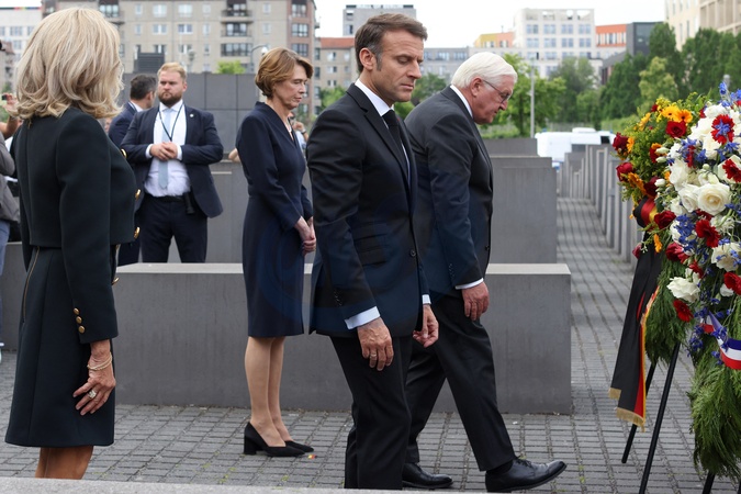 Prezydent Francji Emmanuel Macron i Pierwsza Dama Brigitte Macron, Franck-Walter Steinmeier, Prezydent Republiki Federalnej Niemiec i Pani Elke Budenbender, pod Pomnikiem Holokaustu w Berlinie.