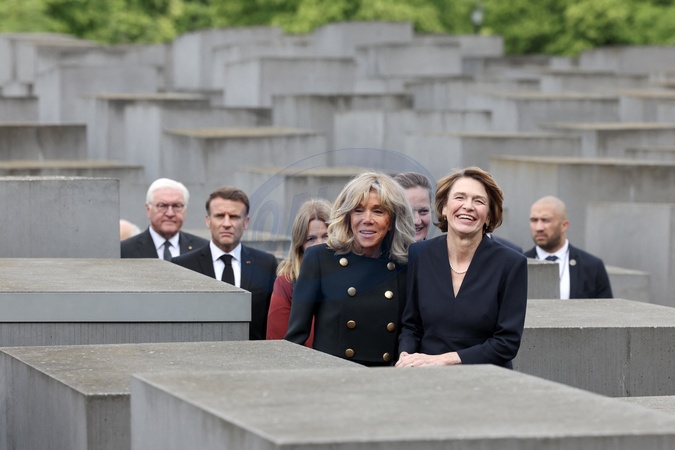 Le président français, Emmanuel Macron et la première dame, Brigitte Macron, Franck-Walter Steinmeier, président de la république fédérale d'Allemagne et madame Elke Budenbender - Le président français, E.Macron et la première dame, B.Macron, F.W.Steinmeier, président de la république fédérale d'Allemagne et madame E.Budenbender, au Mémorial de l'Holocauste à Berlin, le 27 mai 2024. Les époux Klarsfeld, et leur fils A.Klarsfeld, étaient également présents. Le couple présidentiel est en visite d'Etat de trois jours en Allemagne, du 26 au 28 mai 2024. © Stéphane Lemouton / Bestimage French President E.Macron and First Lady B.Macron, F.W.Steinmeier, President of the Federal Republic of Germany and Mrs. E.Budenbender, at the Holocaust Memorial in Berlin, May 27, 2024. The Klarsfeld couple , and their son A.Klarsfeld, were also present. The presidential couple is on a three-day state visit to Germany, from May 26 to 28, 2024.