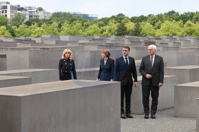 Prezydent Francji Emmanuel Macron i Pierwsza Dama Brigitte Macron, Franck-Walter Steinmeier, Prezydent Republiki Federalnej Niemiec i Pani Elke Budenbender, pod Pomnikiem Holokaustu w Berlinie.