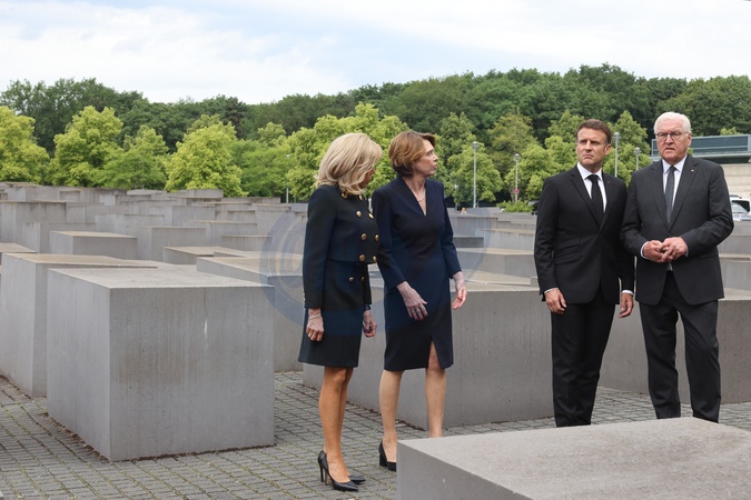 Prezydent Francji Emmanuel Macron i Pierwsza Dama Brigitte Macron, Franck-Walter Steinmeier, Prezydent Republiki Federalnej Niemiec i Pani Elke Budenbender, pod Pomnikiem Holokaustu w Berlinie.