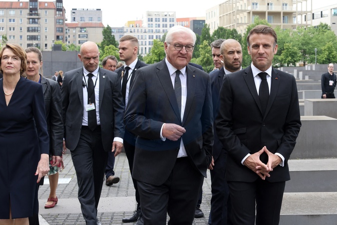 Prezydent Francji Emmanuel Macron i Pierwsza Dama Brigitte Macron, Franck-Walter Steinmeier, Prezydent Republiki Federalnej Niemiec i Pani Elke Budenbender, pod Pomnikiem Holokaustu w Berlinie.