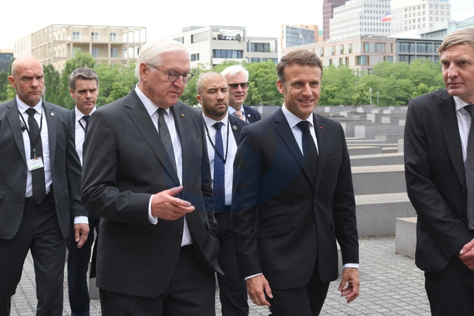 Le président français, Emmanuel Macron et Franck-Walter Steinmeier, président de la république fédérale d'Allemagne - Le président français, E.Macron et la première dame, B.Macron, F.W.Steinmeier, président de la république fédérale d'Allemagne et madame E.Budenbender, au Mémorial de l'Holocauste à Berlin, le 27 mai 2024. Les époux Klarsfeld, et leur fils A.Klarsfeld, étaient également présents. Le couple présidentiel est en visite d'Etat de trois jours en Allemagne, du 26 au 28 mai 2024. © Stéphane Lemouton / Bestimage French President E.Macron and First Lady B.Macron, F.W.Steinmeier, President of the Federal Republic of Germany and Mrs. E.Budenbender, at the Holocaust Memorial in Berlin, May 27, 2024. The Klarsfeld couple , and their son A.Klarsfeld, were also present. The presidential couple is on a three-day state visit to Germany, from May 26 to 28, 2024.