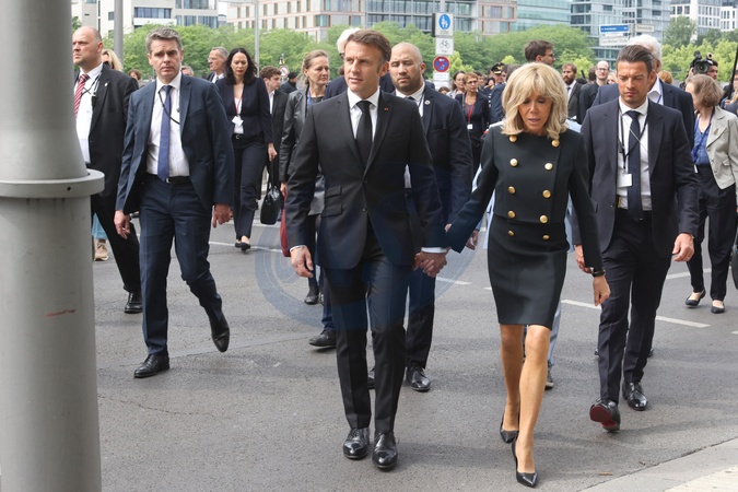 Le président français, Emmanuel Macron et la première dame, Brigitte Macron - Le président français, E.Macron et la première dame, B.Macron, F.W.Steinmeier, président de la république fédérale d'Allemagne et madame E.Budenbender, au Mémorial de l'Holocauste à Berlin, le 27 mai 2024. Les époux Klarsfeld, et leur fils A.Klarsfeld, étaient également présents. Le couple présidentiel est en visite d'Etat de trois jours en Allemagne, du 26 au 28 mai 2024. © Stéphane Lemouton / Bestimage French President E.Macron and First Lady B.Macron, F.W.Steinmeier, President of the Federal Republic of Germany and Mrs. E.Budenbender, at the Holocaust Memorial in Berlin, May 27, 2024. The Klarsfeld couple , and their son A.Klarsfeld, were also present. The presidential couple is on a three-day state visit to Germany, from May 26 to 28, 2024.