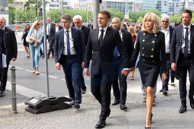 Le président français, Emmanuel Macron et la première dame, Brigitte Macron - Le président français, E.Macron et la première dame, B.Macron, F.W.Steinmeier, président de la république fédérale d'Allemagne et madame E.Budenbender, au Mémorial de l'Holocauste à Berlin, le 27 mai 2024. Les époux Klarsfeld, et leur fils A.Klarsfeld, étaient également présents. Le couple présidentiel est en visite d'Etat de trois jours en Allemagne, du 26 au 28 mai 2024. © Stéphane Lemouton / Bestimage French President E.Macron and First Lady B.Macron, F.W.Steinmeier, President of the Federal Republic of Germany and Mrs. E.Budenbender, at the Holocaust Memorial in Berlin, May 27, 2024. The Klarsfeld couple , and their son A.Klarsfeld, were also present. The presidential couple is on a three-day state visit to Germany, from May 26 to 28, 2024.