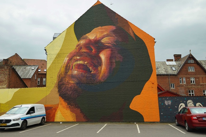 Vejle, Jutland, Denmark - Street ArtCommisioned by local Municipal Councils throughout Denmark to deliver positive messages to society. The Urban spaces have undergone an amazing transformation.The following artists have participated so far:Berit Bærentsen, Britta Egebjerg, Danail Kraev, Jens Jacobsen, Jonathan (Facio), Jules Leduc, Junette Bay, Nanna Nør, Olivia Linn, Stine Ofelia, Maria Tonsgaard, Eske Touborg, Christoffer Bukh, Peter Skensved and Jens Stentoft., Credit:ANDREW POWELL / Avalon