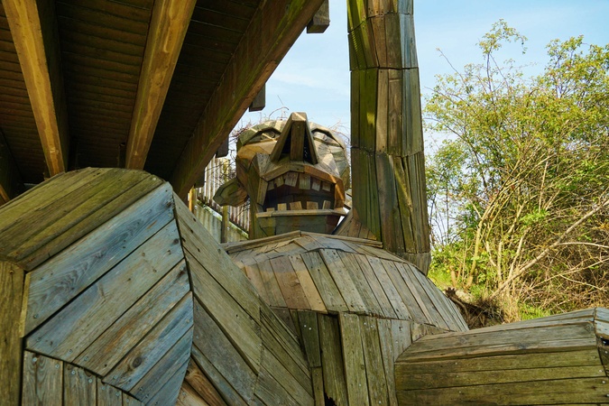 Copenhagen, Ishøj, Denmark - Six Forgotten Giants by Thomas Dambo#013 Oscar Under BroenGo on a treasure hunt to find The Six Forgotten Giants in the western municipalities of Copenhagen: Rødovre, Hvidovre, Vallensbæk, Ishøj, Albertslund and Høje Taastrup. All six sculptures were made from scrap wood with the help of local volunteers. The project wanted to bring art out of the museum, show the beautiful and often overlooked nature spots, and at the same time give an exciting and different experience., Credit:ANDREW POWELL / Avalon