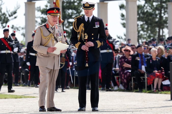 Le président Emmanuel Macron et le roi Charles III d'Angleterre accompagnés de Brigitte Macron et la reine consort Camilla lors de la cérémonie franco-britannique au mémorial de Ver-sur-mer, lors du 80ème anniversaire du débarquement