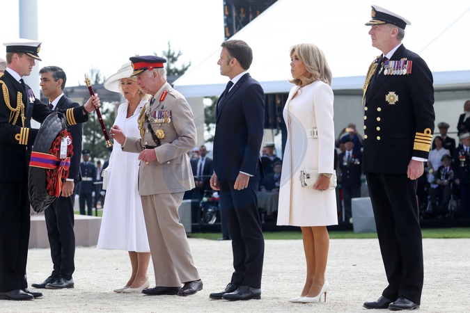 Le président Emmanuel Macron et le roi Charles III d'Angleterre accompagnés de Brigitte Macron et la reine consort Camilla lors de la cérémonie franco-britannique au mémorial de Ver-sur-mer, lors du 80ème anniversaire du débarquement