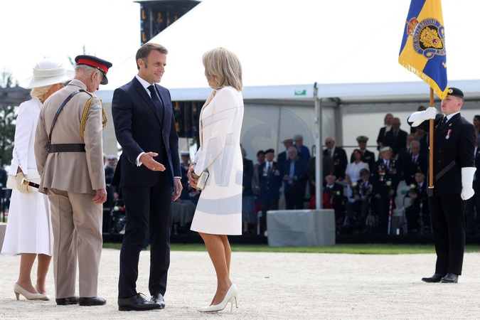Le président Emmanuel Macron et le roi Charles III d'Angleterre accompagnés de Brigitte Macron et la reine consort Camilla lors de la cérémonie franco-britannique au mémorial de Ver-sur-mer, lors du 80ème anniversaire du débarquement