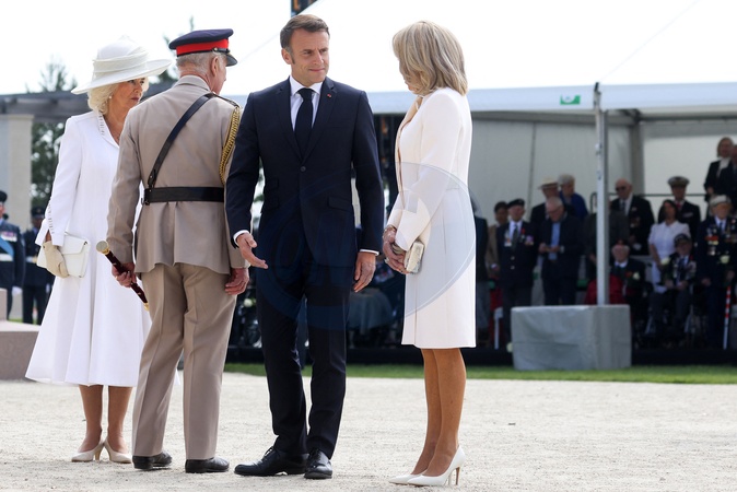 Le président Emmanuel Macron et le roi Charles III d'Angleterre accompagnés de Brigitte Macron et la reine consort Camilla lors de la cérémonie franco-britannique au mémorial de Ver-sur-mer, lors du 80ème anniversaire du débarquement