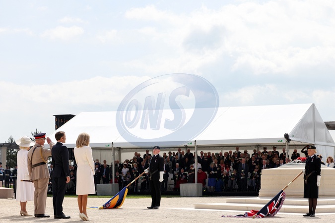 Le président Emmanuel Macron et le roi Charles III d'Angleterre accompagnés de Brigitte Macron et la reine consort Camilla lors de la cérémonie franco-britannique au mémorial de Ver-sur-mer, lors du 80ème anniversaire du débarquement