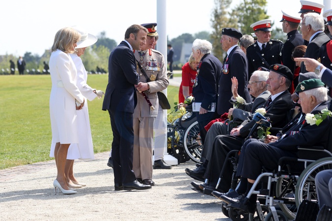 Prezydent Emmanuel Macron i król Anglii Karol III w towarzystwie Brigitte Macron i królowej małżonki Camilli podczas francusko-brytyjskiej ceremonii pod pomnikiem Ver-sur-mer w 80. rocznicę lądowania