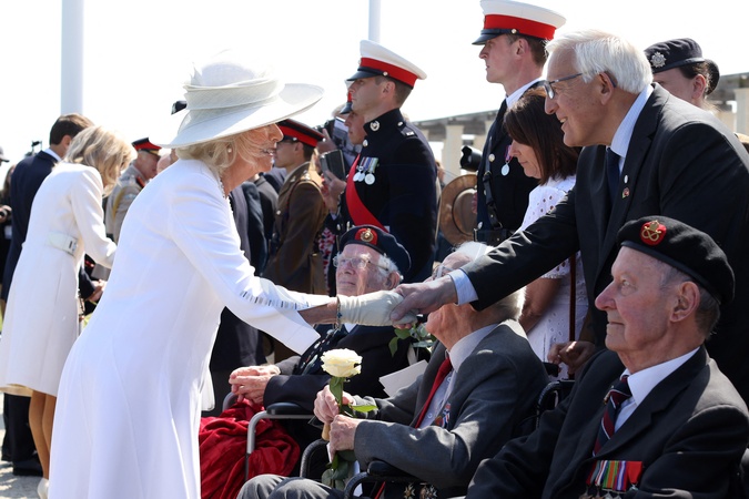 Le président français, Emmanuel Macron et le roi Charles III d'Angleterre accompagné de la première dame, Brigitte Macron et la Camilla Parker Bowles, reine consort d'Angleterre lors de la cérémonie franco-britannique au mémorial de Ver-sur-mer, lors du 80e anniversaire du débarquement, le 6 juin 2024. © Stéphane Lemouton/Bestimage French President and King of England accompanied by French First Lady and Queen during the Franco-British ceremony at the Ver-sur-mer memorial, during the 80th anniversary of the D-Day landings, on 6 June 2024.