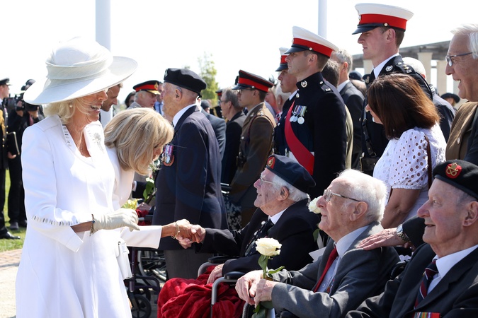 Le président français, Emmanuel Macron et le roi Charles III d'Angleterre accompagné de la première dame, Brigitte Macron et la Camilla Parker Bowles, reine consort d'Angleterre lors de la cérémonie franco-britannique au mémorial de Ver-sur-mer, lors du 80e anniversaire du débarquement, le 6 juin 2024. © Stéphane Lemouton/Bestimage French President and King of England accompanied by French First Lady and Queen during the Franco-British ceremony at the Ver-sur-mer memorial, during the 80th anniversary of the D-Day landings, on 6 June 2024.