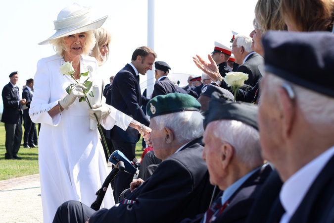 Prezydent Emmanuel Macron i król Anglii Karol III w towarzystwie Brigitte Macron i królowej małżonki Camilli podczas francusko-brytyjskiej ceremonii pod pomnikiem Ver-sur-mer w 80. rocznicę lądowania