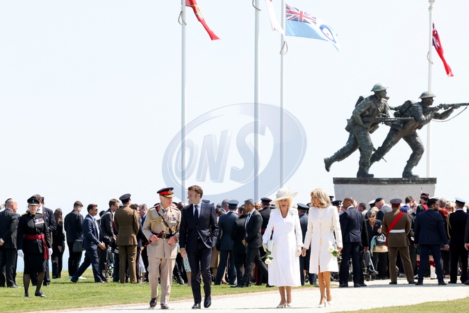 Le président Emmanuel Macron et le roi Charles III d'Angleterre accompagnés de Brigitte Macron et la reine consort Camilla lors de la cérémonie franco-britannique au mémorial de Ver-sur-mer, lors du 80ème anniversaire du débarquement