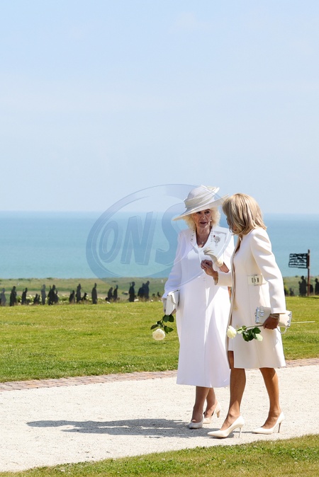 Le président français, Emmanuel Macron et le roi Charles III d'Angleterre accompagné de la première dame, Brigitte Macron et la Camilla Parker Bowles, reine consort d'Angleterre lors de la cérémonie franco-britannique au mémorial de Ver-sur-mer, lors du 80e anniversaire du débarquement, le 6 juin 2024. © Stéphane Lemouton/Bestimage French President and King of England accompanied by French First Lady and Queen during the Franco-British ceremony at the Ver-sur-mer memorial, during the 80th anniversary of the D-Day landings, on 6 June 2024.