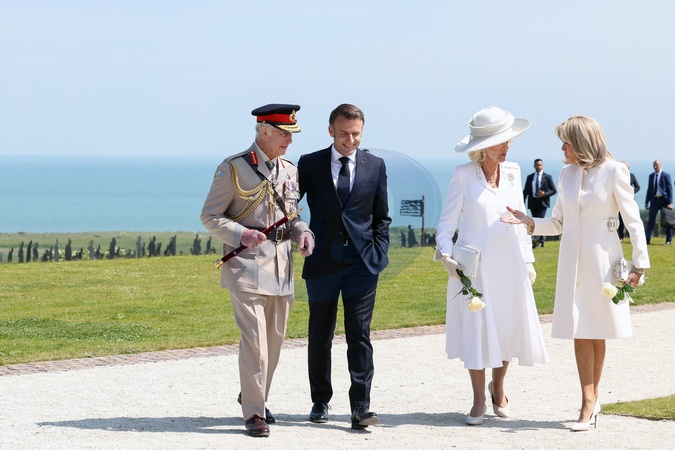 Prezydent Emmanuel Macron i król Anglii Karol III w towarzystwie Brigitte Macron i królowej małżonki Camilli podczas francusko-brytyjskiej ceremonii pod pomnikiem Ver-sur-mer w 80. rocznicę lądowania