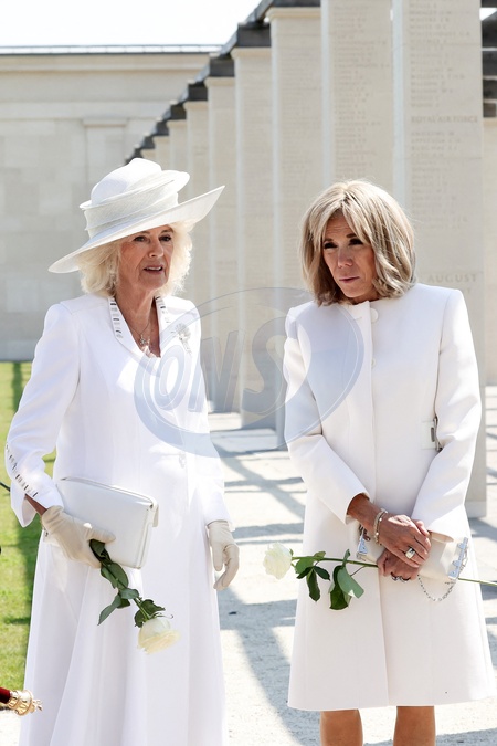 Le président français, Emmanuel Macron et le roi Charles III d'Angleterre accompagné de la première dame, Brigitte Macron et la Camilla Parker Bowles, reine consort d'Angleterre lors de la cérémonie franco-britannique au mémorial de Ver-sur-mer, lors du 80e anniversaire du débarquement, le 6 juin 2024. © Stéphane Lemouton/Bestimage French President and King of England accompanied by French First Lady and Queen during the Franco-British ceremony at the Ver-sur-mer memorial, during the 80th anniversary of the D-Day landings, on 6 June 2024.