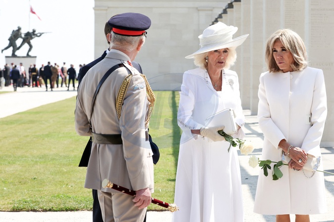 Le président français, Emmanuel Macron et le roi Charles III d'Angleterre accompagné de la première dame, Brigitte Macron et la Camilla Parker Bowles, reine consort d'Angleterre lors de la cérémonie franco-britannique au mémorial de Ver-sur-mer, lors du 80e anniversaire du débarquement, le 6 juin 2024. © Stéphane Lemouton/Bestimage French President and King of England accompanied by French First Lady and Queen during the Franco-British ceremony at the Ver-sur-mer memorial, during the 80th anniversary of the D-Day landings, on 6 June 2024.