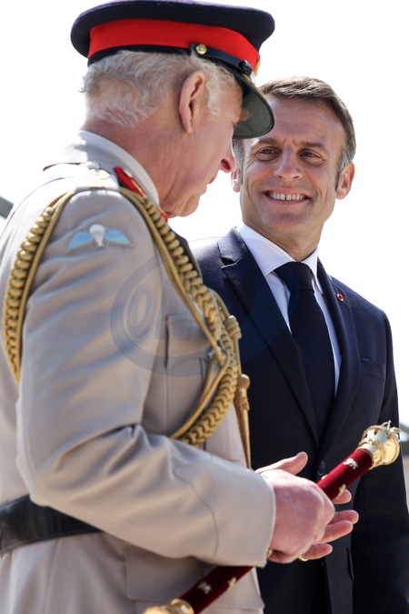 Le président Emmanuel Macron et le roi Charles III d'Angleterre accompagnés de Brigitte Macron et la reine consort Camilla lors de la cérémonie franco-britannique au mémorial de Ver-sur-mer, lors du 80ème anniversaire du débarquement