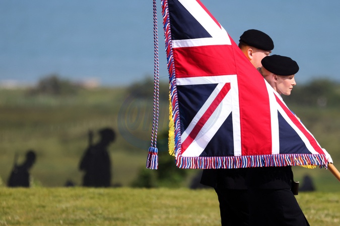 Le président Emmanuel Macron et le roi Charles III d'Angleterre accompagnés de Brigitte Macron et la reine consort Camilla lors de la cérémonie franco-britannique au mémorial de Ver-sur-mer, lors du 80ème anniversaire du débarquement
