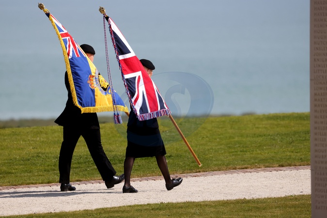 Le président Emmanuel Macron et le roi Charles III d'Angleterre accompagnés de Brigitte Macron et la reine consort Camilla lors de la cérémonie franco-britannique au mémorial de Ver-sur-mer, lors du 80ème anniversaire du débarquement