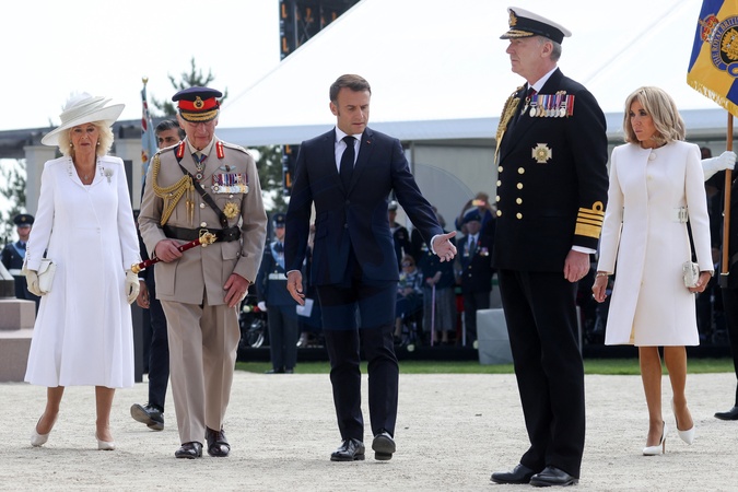 Prezydent Emmanuel Macron i król Anglii Karol III w towarzystwie Brigitte Macron i królowej małżonki Camilli podczas francusko-brytyjskiej ceremonii pod pomnikiem Ver-sur-mer w 80. rocznicę lądowania