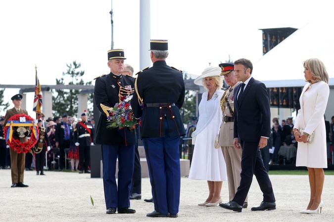 Le président Emmanuel Macron et le roi Charles III d'Angleterre accompagnés de Brigitte Macron et la reine consort Camilla lors de la cérémonie franco-britannique au mémorial de Ver-sur-mer, lors du 80ème anniversaire du débarquement