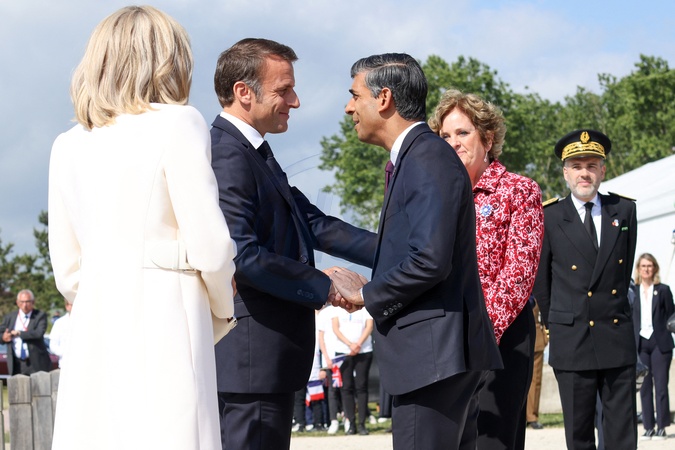 Prezydent Emmanuel Macron i król Anglii Karol III w towarzystwie Brigitte Macron i królowej małżonki Camilli podczas francusko-brytyjskiej ceremonii pod pomnikiem Ver-sur-mer w 80. rocznicę lądowania