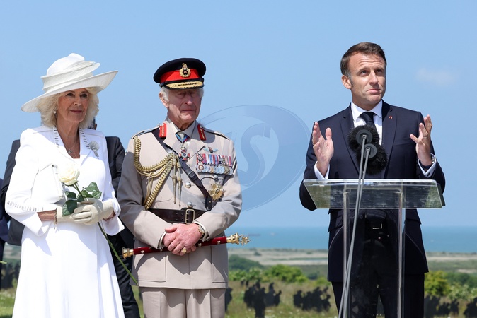 Le président Emmanuel Macron et le roi Charles III d'Angleterre accompagnés de Brigitte Macron et la reine consort Camilla lors de la cérémonie franco-britannique au mémorial de Ver-sur-mer, lors du 80ème anniversaire du débarquement