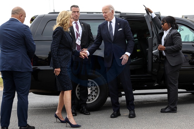 Le président américain Joe Biden et son épouse Jill Biden lors de la cérémonie internationale du 80ème anniversaire du débarquement à Omaha Beach, le 6 juin 2024. © Stéphane Lemouton / Bestimage President Emmanuel Macron and his wife Brigitte Macron welcome guests to the international ceremony at Omaha Beach as part of the commemoration of the 80th anniversary of the Normandy landings (D-Day) on june 6th 2024