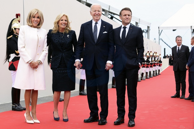 Prezydent Emmanuel Macron Brigitte Macron prez Biden witają gości na międzynarodowej ceremonii na plaży Omaha w ramach obchodów 80. rocznicy lądowania w Normandii (D-Day