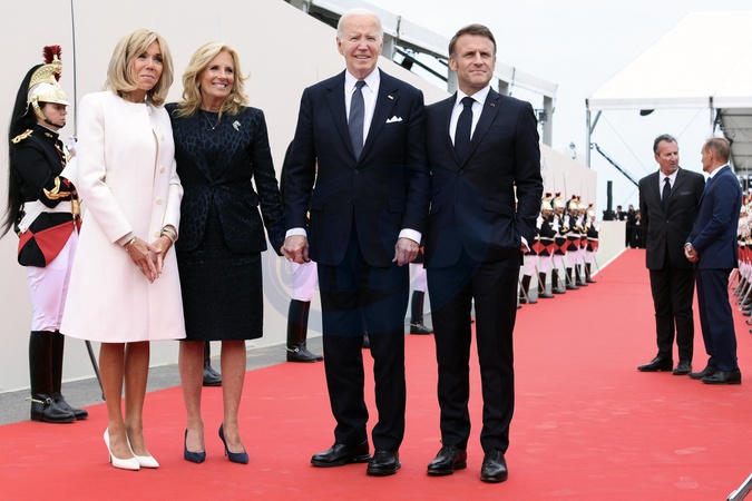 Prezydent Emmanuel Macron Brigitte Macron prez Biden witają gości na międzynarodowej ceremonii na plaży Omaha w ramach obchodów 80. rocznicy lądowania w Normandii (D-Day