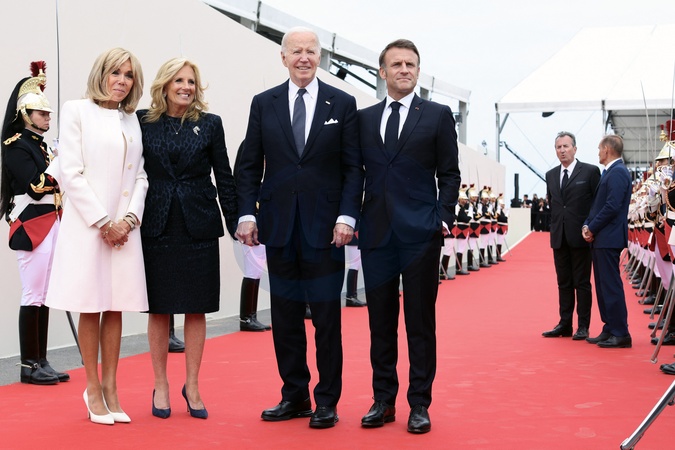 Prezydent Emmanuel Macron Brigitte Macron prez Biden witają gości na międzynarodowej ceremonii na plaży Omaha w ramach obchodów 80. rocznicy lądowania w Normandii (D-Day