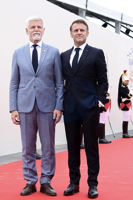 Le président français Emmanuel Macron accueille le président tchèque Petr Pavel lors de la cérémonie internationale du 80ème anniversaire du débarquement à Omaha Beach, le 6 juin 2024. © Stéphane Lemouton / Bestimage President Emmanuel Macron and his wife Brigitte Macron welcome guests to the international ceremony at Omaha Beach as part of the commemoration of the 80th anniversary of the Normandy landings (D-Day) on june 6th 2024