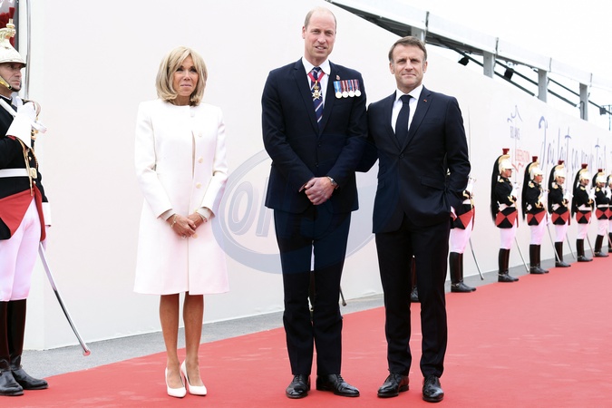 Le président français Emmanuel Macron et la première dame, Brigitte Macron accueillent le Prince William lors de la cérémonie internationale du 80ème anniversaire du débarquement à Omaha Beach, le 6 juin 2024. © Stéphane Lemouton / Bestimage President Emmanuel Macron and his wife Brigitte Macron welcome guests to the international ceremony at Omaha Beach as part of the commemoration of the 80th anniversary of the Normandy landings (D-Day) on june 6th 2024