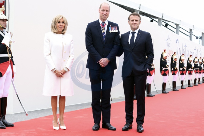 Le président français Emmanuel Macron et la première dame, Brigitte Macron accueillent le Prince William lors de la cérémonie internationale du 80ème anniversaire du débarquement à Omaha Beach, le 6 juin 2024. © Stéphane Lemouton / Bestimage President Emmanuel Macron and his wife Brigitte Macron welcome guests to the international ceremony at Omaha Beach as part of the commemoration of the 80th anniversary of the Normandy landings (D-Day) on june 6th 2024